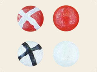 打毬で使う毬は、平毬と揚毬の2種類があるよ。決勝のための揚毬には十文字がつけられているよ。